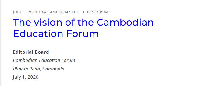 Cambodian Education Forum (CEF) is a forum for education. It aims to provide a virtual platform for learners, educators, researchers, administrators, government officials, NGOs staff and others to share scientific knowledge, understanding and informed critical opinions on current issues, solutions and policy recommendations to improve the quality of education, teaching and learning in Cambodia. Although our focus in on education in Cambodia, we welcome and publish unsolicited informed opinions and insights on educational issues facing countries in the region and beyond.