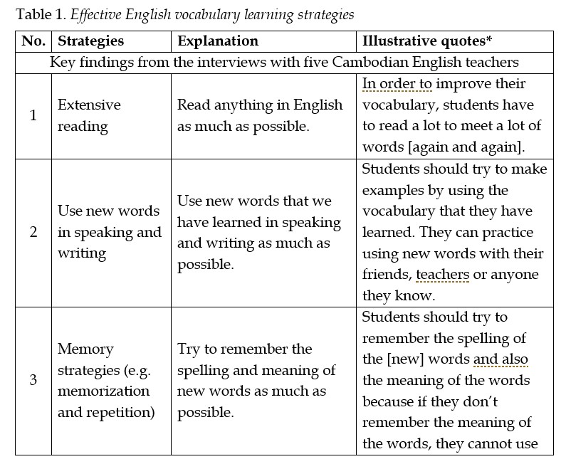 To provide English learners, especially Cambodian English learners, with some ideas on how to learn English vocabulary effectively, this short article presents learning strategies believed to be effective for learning English vocabulary. The ideas presented in this essay are based on research findings drawn from the author’s unpublished master’s thesis conducted about 10 years ago. Although the research on which this article is based is relatively old, its findings are still highly relevant and applicable to the current context of English language learning in Cambodia and beyond.
