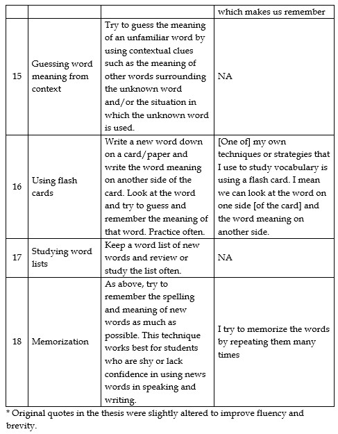 As can be seen in Table 1, there are many strategies the participants perceived to be effective for learning new English vocabulary. Although generalization was not the aim of the study, it is worth mentioning that a few strategies were commonly used by both the teachers and the students. They include extensive reading, dictionary use, practicing new words in speaking and writing, memorization, and keeping word lists or vocabulary notebooks.