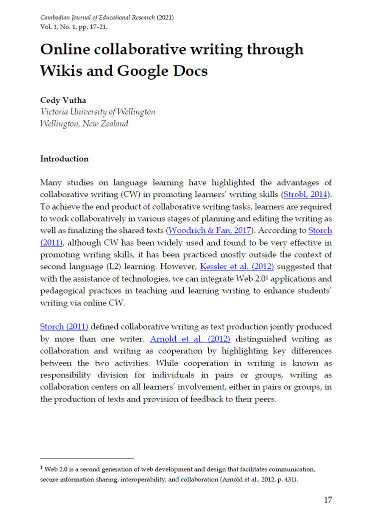 Strobl. Carola. (2014). Affordances of Web 2.0 technologies for collaborative advanced writing in a foreign language. CALICO Journal, 31(1), 1–18. https://doi.org/10.11139/cj.31.1.1-18