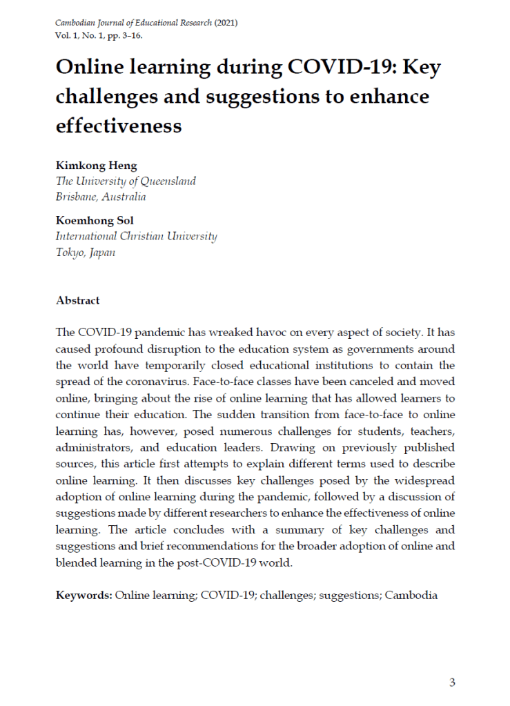 Heng, K., & Sol, K. (2020, December 08). Online learning during COVID-19: Key challenges and suggestions to enhance effectiveness. Cambodian Education Forum. https://cambodianeducationforum.wordpress.com/2020/12/08/online-learning-during-covid-19-key-challenges-and-suggestions-to-enhance-effectiveness/