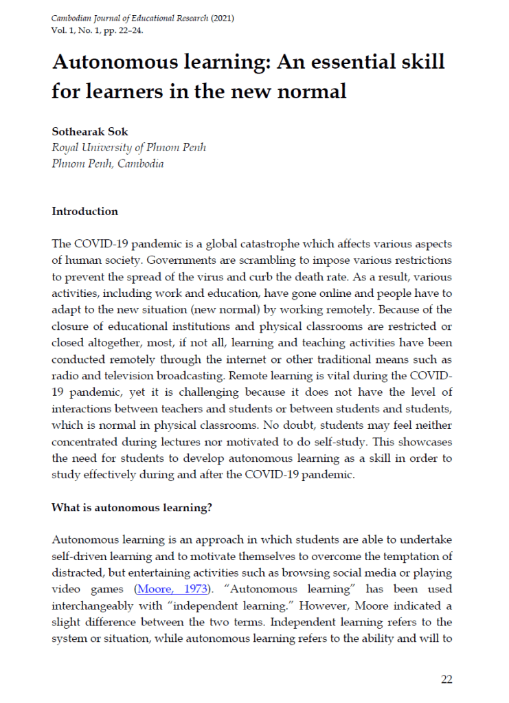 In short, being autonomous allows us to attend our academic life proactively and to grab opportunity along the way. I believe Cambodian students need to shift away from a lecture-is-learning mindset and embrace a more rigorous approach toward education. At the same time, teachers should act as consultants who provide guidance when appropriate. That way, learner autonomy and a lifelong learning culture can be developed.