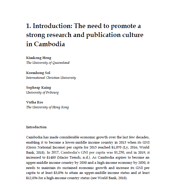 Heng, K., Sol, K., Kaing, S., & Ros, V. (2020). Introduction: The need to promote a strong research and publication culture in Cambodia. In K. Heng, S. Kaing, V. Ros, & K. Sol (Eds.), English language teaching, education, and online learning in Cambodia during COVID-19: Perspectives from practitioners and researchers (pp. 1-10). Phnom Penh: Cambodian Education Forum.