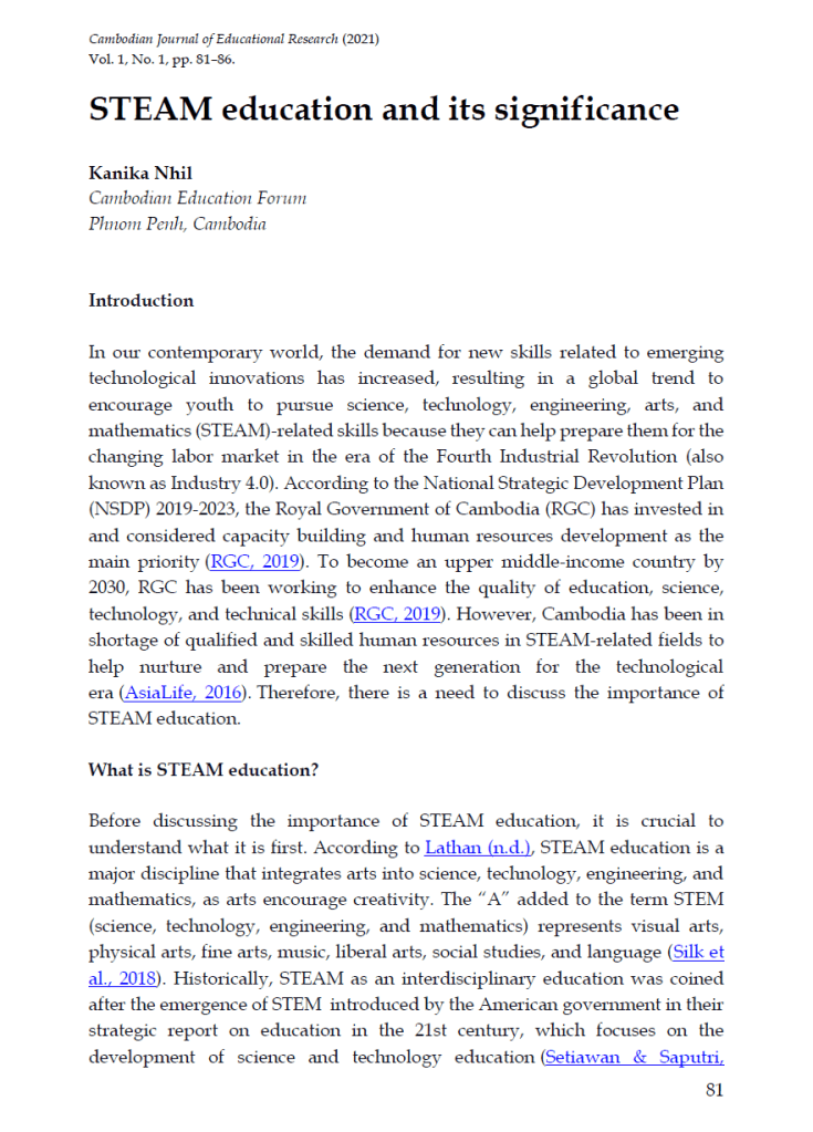 In our contemporary world, the demand for new skills related to emerging technological innovations has increased, resulting in a global trend to encourage youth to pursue science, technology, engineering, arts, and mathematics (STEAM)-related skills because they can help prepare them for the changing labor market in the era of the Fourth Industrial Revolution (also known as Industry 4.0). According to the National Strategic Development Plan (NSDP) 2019-2023, the Royal Government of Cambodia (RGC) has invested in and considered capacity building and human resources development as the main priority (RGC, 2019). To become an upper middle-income country by 2030, RGC has been working to enhance the quality of education, science, technology, and technical skills (RGC, 2019). However, Cambodia has been in shortage of qualified and skilled human resources in STEAM-related fields to help nurture and prepare the next generation for the technological era (AsiaLife, 2016). Therefore, there is a need to discuss the importance of STEAM education.