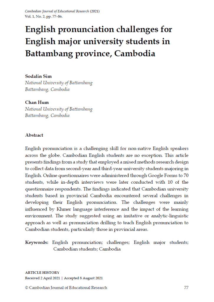 Keywords: English pronunciation; challenges; English major students; Cambodian students; Cambodia