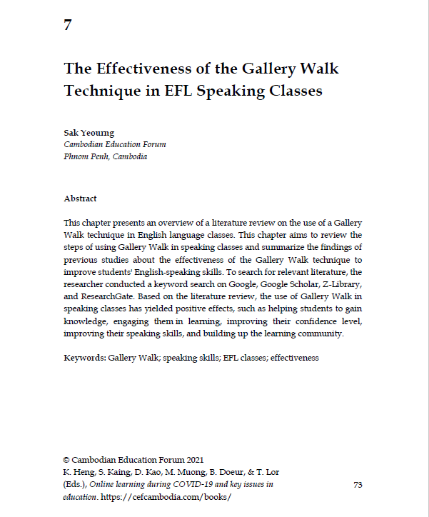 In conclusion, as this chapter is based on a review of past studies, future research, including classroom research, should be conducted to explore how the Gallery Walk technique can be applied in the Cambodian EFL classes and how effective it is in helping students to enhance their English-speaking skills.