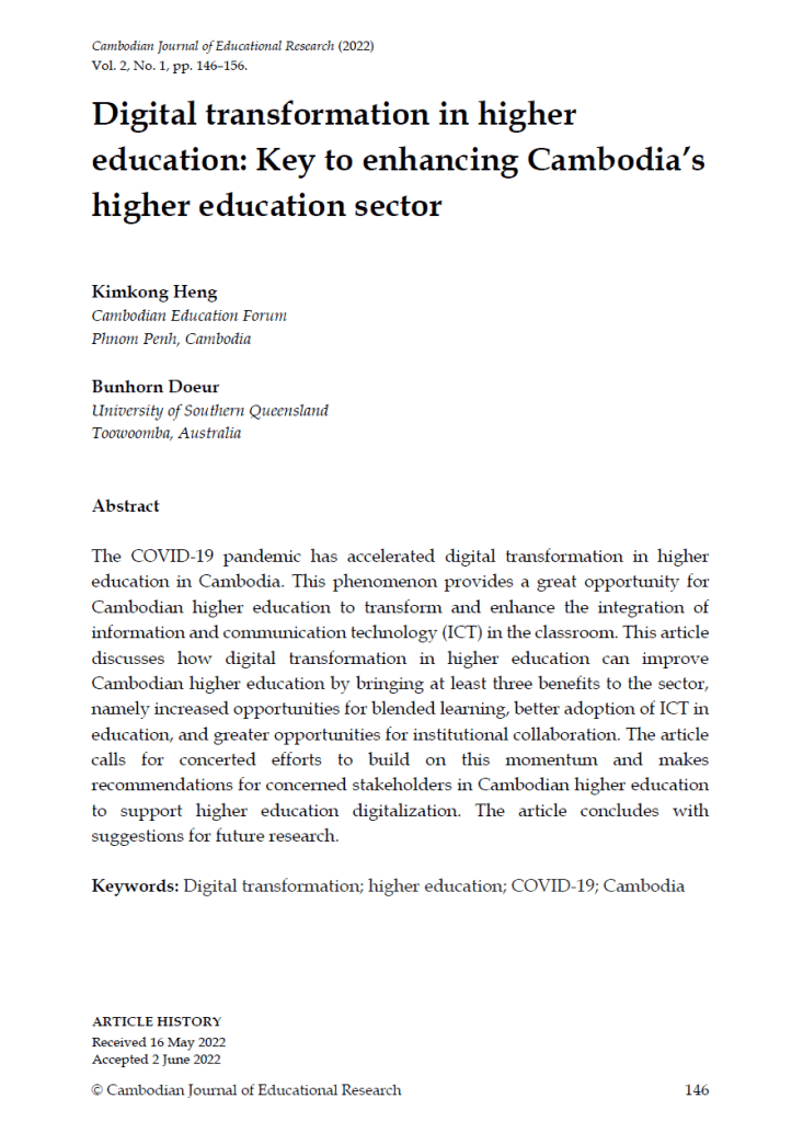 This article has shown that the digital transformation in higher education is key to enhancing the higher education sector in Cambodia. The article discussed three positive points that Cambodian higher education could benefit from the pandemic-induced digital transformation in higher education. The benefits included (1) increased opportunities for blended learning, (2) better adoption of ICT in education, and (3) greater opportunities for institutional collaboration.