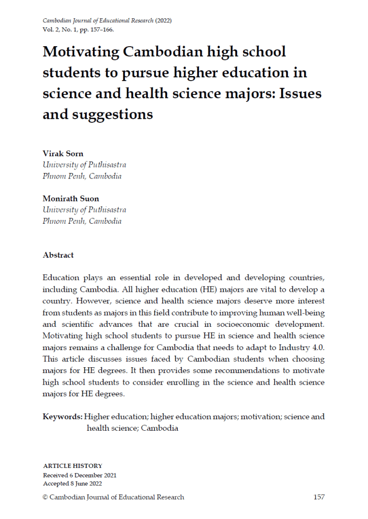 Against this background, this article aims to discuss issues regarding the selection of HE majors among Cambodian high school students and suggestions to motivate them to select science and health science majors in HE. The article starts by looking at factors influencing students’ choice of university majors. It then provides some suggestions to motivate students to choose science and health science majors when they pursue HE.