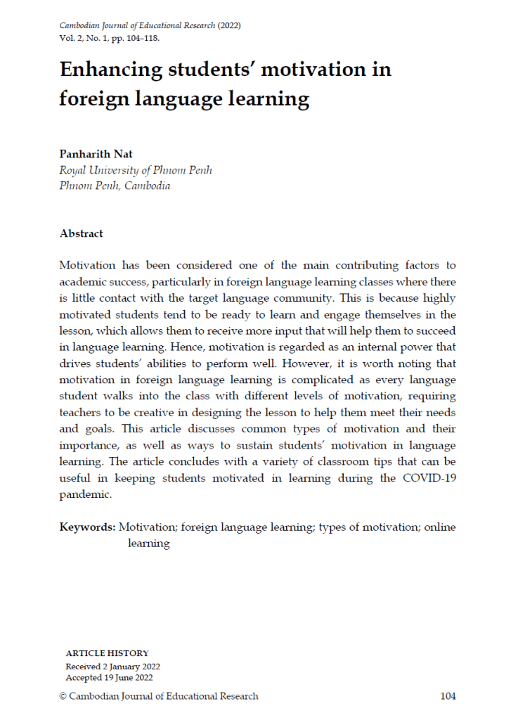 Panharith Nat is currently a lecturer of English at the Institute of Foreign Languages (IFL), Royal University of Phnom Penh (RUPP). Previously, he worked as a full-time primary teacher of English at Paññāsāstra International School and as a part-time teacher of English at ASEAN-Cambodia International School in Ang Snoul District, Kandal Province. He received a Bachelor of Education in English from IFL, RUPP. His research interests include literature teaching in EFL contexts, learner motivation, language acquisition, and English language teaching.