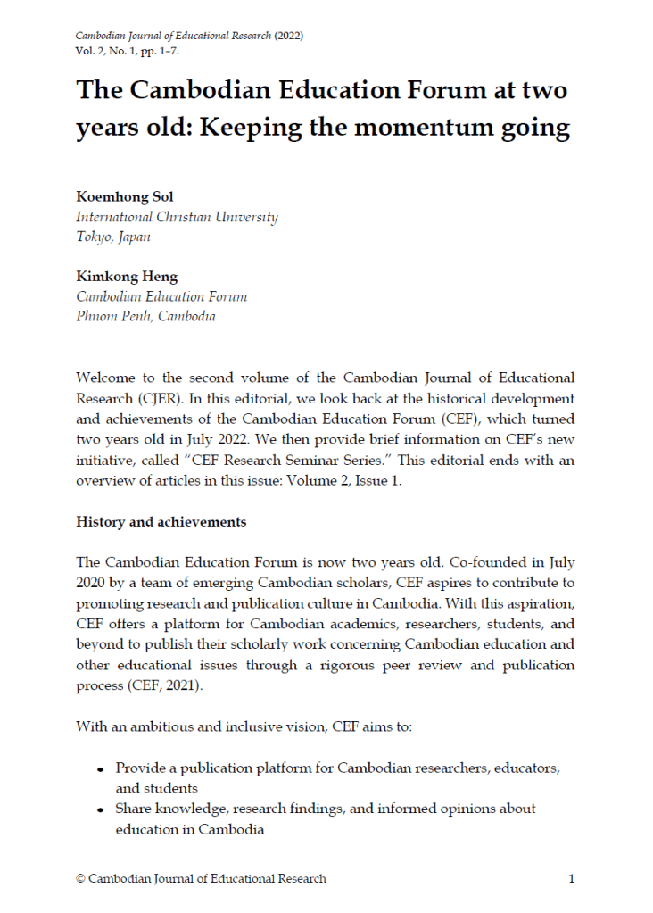 Welcome to the second volume of the Cambodian Journal of Educational Research (CJER). In this editorial, we look back at the historical development and achievements of the Cambodian Education Forum (CEF), which turned two years old in July 2022. We then provide brief information on CEF’s new initiative, called “CEF Research Seminar Series.” This editorial ends with an overview of articles in this issue: Volume 2, Issue 1.