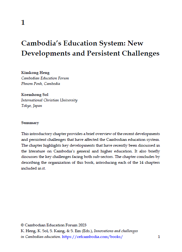 Heng, K., & Sol, K. (2023a). Challenges facing higher education in Cambodia and ideas for reform. Cambodian Journal of Educational Research, 3(1), 1-19. https://cefcambodia.com/2023/08/13/challenges-facing-higher-education-in-cambodia-and-ideas-for-reform/