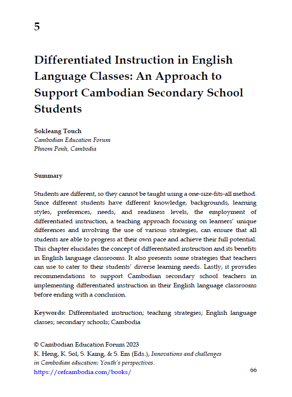 Students are different, so they cannot be taught using a one-size-fits-all method. Since different students have different knowledge, backgrounds, learning styles, preferences, needs, and readiness levels, the employment of differentiated instruction, a teaching approach focusing on learners’ unique differences and involving the use of various strategies, can ensure that all students are able to progress at their own pace and achieve their full potential. This chapter elucidates the concept of differentiated instruction and its benefits in English language classrooms. It also presents some strategies that teachers can use to cater to their students’ diverse learning needs. Lastly, it provides recommendations to support Cambodian secondary school teachers in implementing differentiated instruction in their English language classrooms before ending with a conclusion.