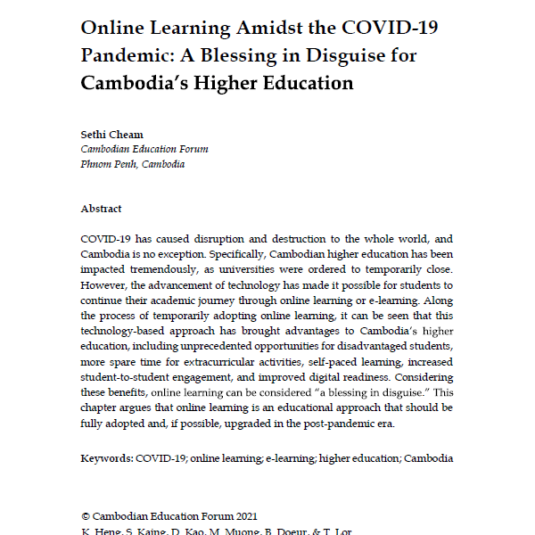 by CambodianEducationForum Posted on December 14, 2021December 19, 2023 Online Learning During COVID-19 and Key Issues in Education Read More