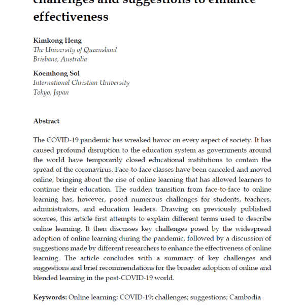 by CambodianEducationForum Posted on December 8, 2020December 20, 2023 Online learning during COVID-19: Key challenges and suggestions to enhance effectiveness Read More