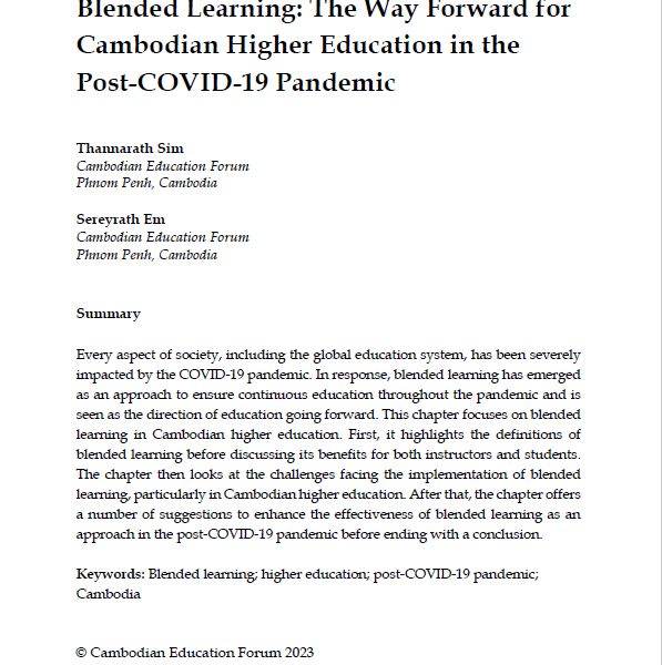 by CambodianEducationForum Posted on September 18, 2023September 18, 2023 Blended Learning: The Way Forward for Cambodian Higher Education in the Post-COVID-19 Pandemic Read More
