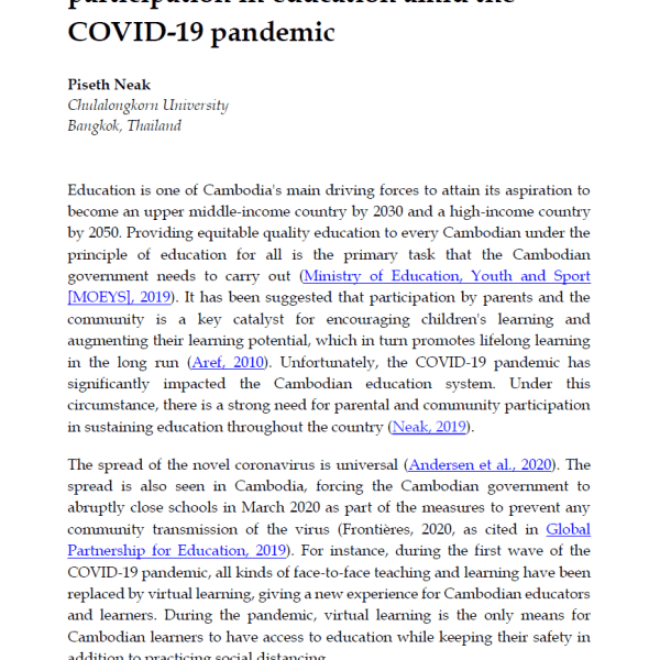 by CambodianEducationForum Posted on January 15, 2021December 20, 2023 The Role of Parental and Community Participation in Education Amid the COVID-19 Pandemic Read More