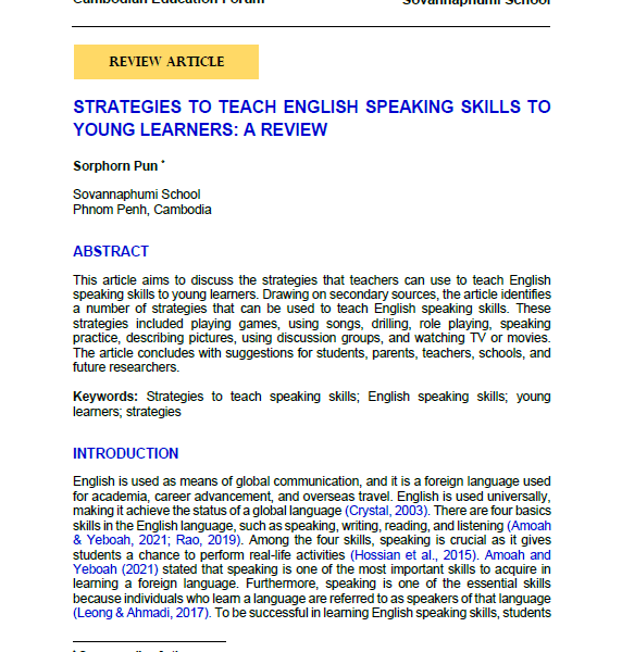 by CambodianEducationForum Posted on October 6, 2025October 6, 2025 Strategies to teach English speaking skills to young learners: A review Read More